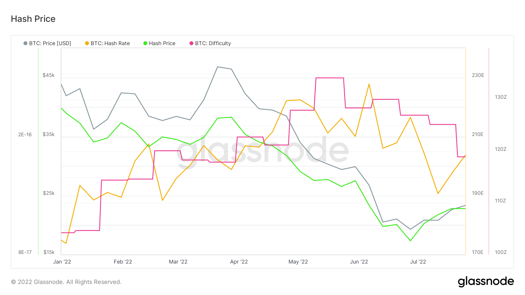 Der gestiegene Hashpreis liegt a) an dem leicht gestiegenen Bitcoin Preis, aber b) in erster Linie an der etwas zurück gegangenen Hashrate (siehe Hash Ribbon). Wie man auch sehen kann ist die Difficulty viermal in fünf Epochen gefallen. Historisch gesehen erreicht der Bitcoin Preis einen Tiefpunkt, wenn die Difficulty ihren Tiefpunkt erreicht hat. Dies hängt damit zusammen, dass ein fallender Bitcoin-Preis die schwächsten Miner zwingt, ihre Bitcoin Reserven und ihr Equipment zu verkaufen, was den Abwärtsdruck auf beide Preise erhöht.