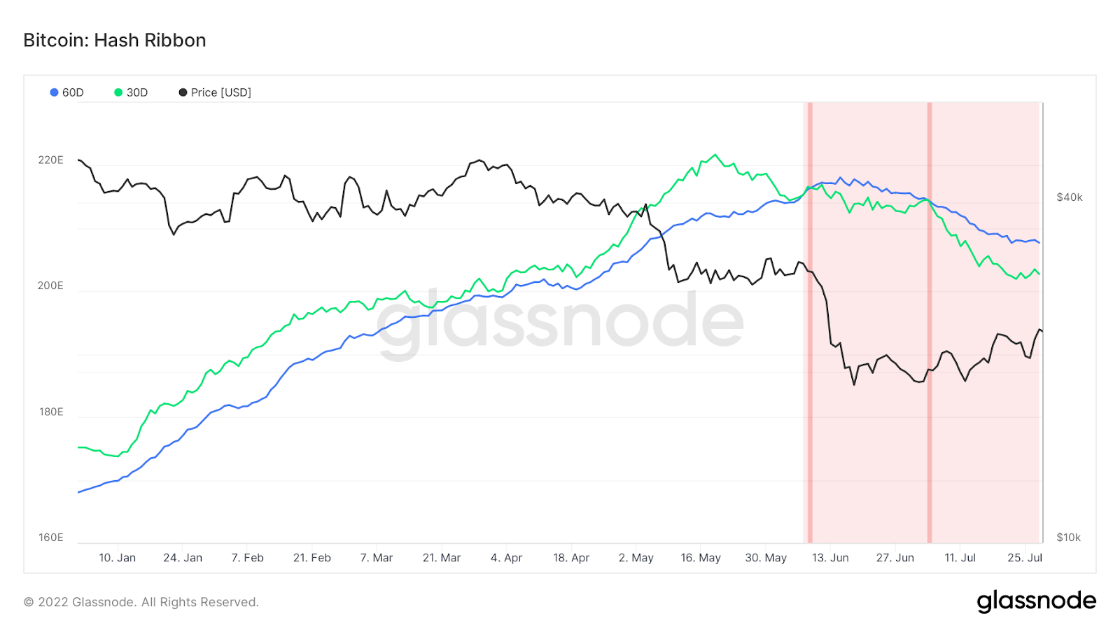 Die anhaltende Miner-Kapitulation wird durch eine fallende Hashrate untermauert. Miner-Kapitulationen sind besonders relevant, da sie zeigen, dass eine große Anzahl von Maschinen abgeschaltet wurde. Seit dem Beginn dieses Kapitulationszyklus ist sehr wahrscheinlich Equipment neuerer Generation angeschlossen worden, allerdings müssen gleichzeitig genügend alte Maschinen, oder ineffiziente, überschuldete Miner abgeschaltet haben, sodass die Hashrate und damit die Difficulty unterm Strich abgenommen haben.